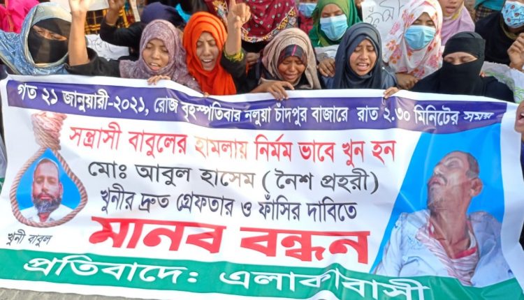 এলাকার নলুয়া চাঁদপুর থেকে লক্ষ্মীপুর ইউনিয়ন পরিষদ পর্যন্ত মিছিল নিয়ে যায় ইউনিয়নবাসীসহ হাশেমের মেয়েরা। পরে তারা ইউনিয়ন পরিষদের সামনে সবাই একত্রিত হয়। মানববন্ধনে বক্তব্য রাখেন মৃত হাসেমের মেয়েরা, ভাগ্নে জহিরুল ইসলাম ও ইউনিয়নবাসী। প্রত্যেকেই প্রধানমন্ত্রীর কাছে খুনি বাবুল মিয়ার ফাঁসি দাবি জানান।