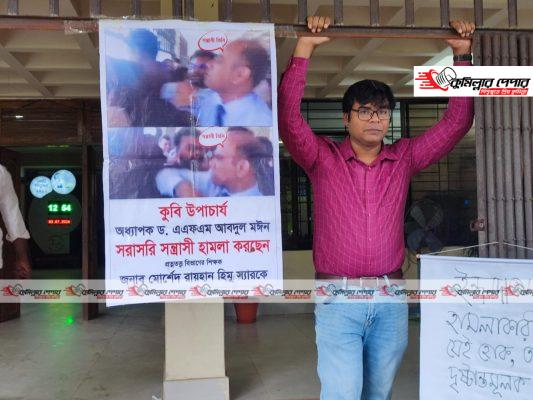 গত ২৮ এপ্রিল শিক্ষকদের উপর হামলার সময় উপাচার্য অধ্যাপক ড.এ এফ এম আবদুল মঈনের হাতে মারধরের শিকার হন প্রত্নতত্ত্ব বিভাগের শিক্ষক মো. মুর্শেদ রায়হান। ঘটনার ৬৫ দিন অতিবাহিত হলেও কোনো বিচার না হওয়ায় একক অবস্থান পালন করেন তিনি। শিক্ষকদের অভিযোগ উপাচার্য একজন শিক্ষককে হামলার মাধ্যমে ওনার পদে থাকার যোগ্যতা হারিয়েছেন।