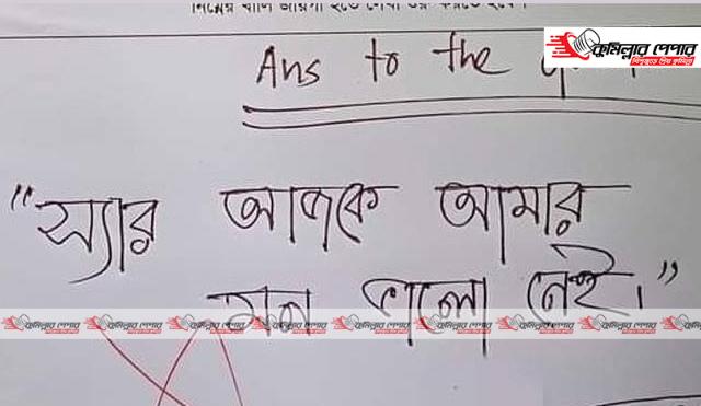 এর উত্তর লেখার অংশে ‘স্যার আজকে আমার মন ভালো নেই’ লেখা রয়েছে। উত্তরপত্রটি কোনো পরীক্ষার অংশ না হলেও এর বাম পাশে লাল কালিতে শূন্য নম্বর দিয়ে ‘বাতিল’ লিখে দেওয়া হয়েছে। ফেইসবুকে ছড়িয়ে পড়া এ ছবি শিক্ষার্থীদের মধ্যে সমালোচনা ও হাস্যরস সৃষ্টি করলে প্রশাসন তৎপর হয়।