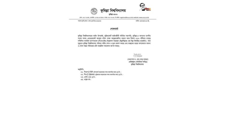 শোক প্রকাশ করে দেওয়া এ শোকবার্তায় বলা হয়, তার মৃত্যুতে কুমিল্লা বিশ্ববিদ্যালয় পরিবার গভীর শােক ও দুঃখ প্রকাশ করছে এবং মরহুমের রূহের মাগফেরাত কামনা ও শোক সন্তপ্ত পরিবারের প্রতি আন্তরিক সমবেদনা জ্ঞাপন করছে।