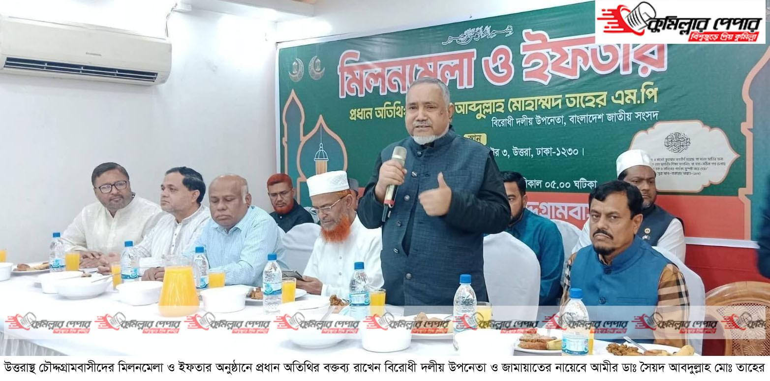 রাজধানীর বৃহত্তর উত্তরাস্থ চৌদ্দগ্রামবাসীকে নিয়ে হোয়াইট হল কনভেনশন সেন্টারে রোববার বিকেলে এক ইফতার মাহফিল অনুষ্ঠিত হয়েছে। এতে প্রধান অতিথির বক্তব্য রাখেন জাতীয় সংসদের বিরোধী দলীয় উপনেতা ও জামায়াতে ইসলামীর কেন্দ্রীয় নায়েবে আমীর ডাঃ আবদুল্লাহ মুহাম্মদ তাহের এমপি। বিশেষ অতিথির বক্তব্য রাখেন জামায়াতে ইসলামীর কেন্দ্রীয় সহকারী সেক্রেটারি জেনারেল মাওলানা আবদুল হালিম। বিশিষ্ট ব্যাবসায়ী ও সমাজ সেবক, ডায়নামিক ট্রেডার্সের ব্যবস্থাপনা অংশীদার মোঃ জসিম উদ্দিনের সভাপতিত্বে এবং বাংলাদেশ শ্রমিক কল্যাণ ফেডারেশনের কেন্দ্রীয় সহ সভাপতি ও কর্ণফুলী হাউজিং লিমিটেডের ব্যবস্থাপনা পরিচালক মুজিবুর রহমান ভূঁইয়ার সঞ্চালনায় ইফতার মাহফিলে অন্যান্যের মধ্যে উপস্থিত ছিলেন ঢাকাস্থ চৌদ্দগ্রাম ফাউন্ডেশনের সভাপতি ভিপি সাহাব উদ্দিন, সেক্রেটারি আইয়ুব আলী ফরায়েজী, বিশিষ্ট ব্যাবসয়ী ও সমাজ সেবক সৈয়দ একরামুল হক হারুন, উত্তরাস্থ লুবানা হসপিটালের ব্যাবস্থাপনা পরিচালক জহিরুল ইসলাম, উত্তরা ১২নং সেক্টর ওয়েলফেয়ার সোসাইটির সাধারণ সম্পাদক দেলোয়ার হোসেন মজুমদার, ঢাকাস্থ চৌদ্দগ্রাম ফাউন্ডেশনের সহ সেক্রেটারি মেশকাত উদ্দিন সেলিম ও মোহাম্মদ ইউসুফ, ঢাকাস্থ চিওড়া সোসাইটির সভাপতি শাহনেওয়াজ কাজল, বিশিষ্ট ব্যাবসয়ী ও সাবেক ছাত্রনেতা বদিউল আলম মজুমদার, ইসমাইল চৌধুরী, আবুল কালাম মজুমদার, চৌদ্দগ্রাম প্রেস ক্লাবের সভাপতি সিরাজুল ইসলাম ফরায়েজী, বিশিষ্ট ব্যাবসয়ী শাহ আলম খোকন, সাবেক ছাত্রনেতা নাজমুল হক মোল্লা বাদল, জাফর আহমদ শিপন প্রমুখ। ইফতার মাহফিলে উত্তরায় বসবাসরত চৌদ্দগ্রামের তিন শতাধিক ব্যক্তিবর্গ অংশগ্রহণ করেন। অনুষ্ঠানে উপস্থিত সকলের সম্মতিতে জাতীয় বিশ্ববিদ্যালয়ের পরিচালক অধ্যাপক সাহাব উদ্দিন আহমদকে সভাপতি, মোঃ জসিম উদ্দিনকে সিনিয়র সহ সভাপতি, মোঃ জহিরুল ইসলামকে সহ সভাপতি এবং দেলোয়ার হোসেন মজুমদারকে সেক্রেটারি করে উত্তরাস্থ চৌদ্দগ্রাম সোসাইটির নতুন কমিটি ঘোষণা করা হয়।