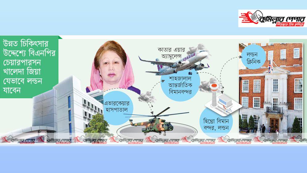 এদিকে বিমান বাংলাদেশ এয়ারলাইন্সের একটি ফ্লাইটে ডা. জোবাইদা রহমান ঢাকায় পৌঁছে সরাসরি এভারকেয়ার হাসপাতালে শাশুড়ির কাছে যাবেন। তিনি খালেদা জিয়ার সফরসঙ্গী হয়ে লন্ডন যাচ্ছেন। লন্ডনের হিথ্রো বিমানবন্দর থেকে খালেদা জিয়াকে সরাসরি লন্ডন ক্লিনিকে ভর্তির জন্য নিয়ে যাওয়া হবে। সূত্র জানায়, এভারকেয়ার হাসপাতাল থেকে স্পেশাল সিকিউরিটি ফোর্সের (এসএসএফ) নিরাপত্তায় হেলিকপ্টারে শাহজালাল আন্তর্জাতিক বিমানবন্দরের উদ্দেশে রওয়ানা দেবেন খালেদা জিয়া। পরে বিমানবন্দর থেকে যুক্তরাজ্যের উদ্দেশে যাত্রা করবেন।