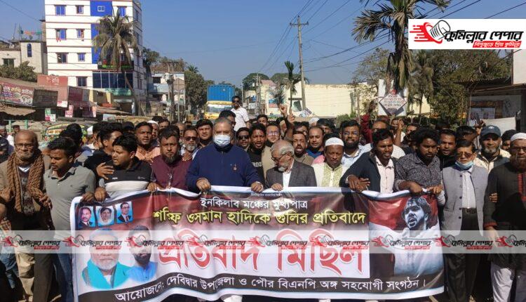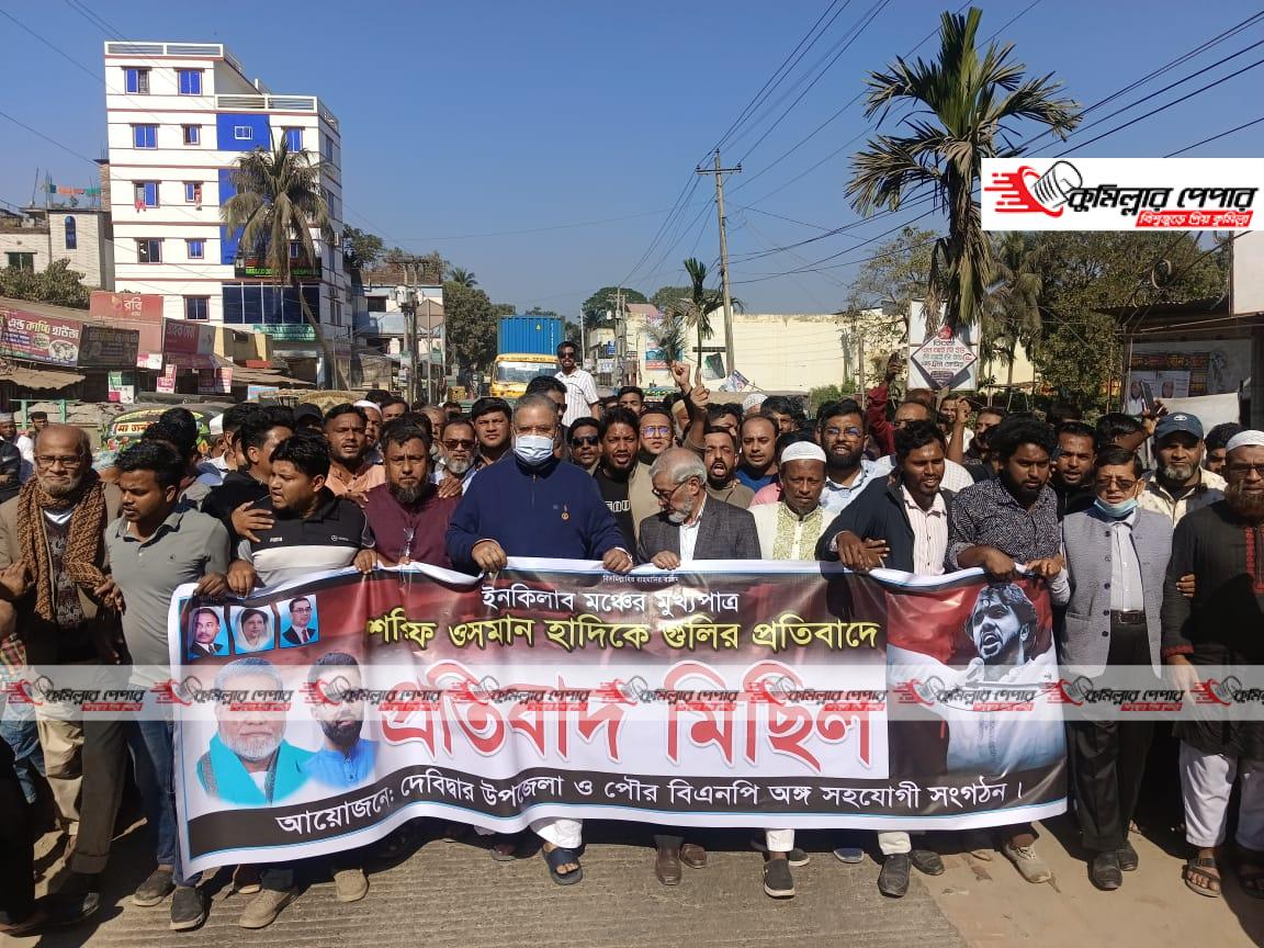 শনিবার (১৩ ডিসেম্বর) দুপুর সাড়ে ১২ টায় কুমিল্লা-৪ দেবিদ্বার আসনের চারবারের সাবেক এমপি আলহাজ্ব ইঞ্জিনিয়ার মঞ্জরুল আহসান মুন্সীর নেতৃত্বে অনুষ্ঠিত ওই মিছিলে দলীল নেতাকর্মী ছাড়াও সাধারণ মানুষ অংশ নেন। মিছিলটি উপজেলা সদরের প্রধান প্রধান সড়ক প্রদক্ষিণ করে মুক্তিযুদ্ধ চত্বরে এসে সমবেত হয়। সেখানে সংক্ষিপ্ত সমাবেশে বক্তৃতারা ওসমান হাদির ওপর হামলাকারীদের দ্রুত গ্রেপ্তার ও বিচারের দাবি করেন। বিএনপির নেতাকর্মীরা ‘জ্বালো রে জ্বালো আগুন জ্বালো, হাদির ওপর হামলা কেন, প্রশাসন জবাব চাই, সন্ত্রাসীদের আস্তানা ভেঙে দাও, গুঁড়িয়ে দাও স্লোগান দিতে থাকে।