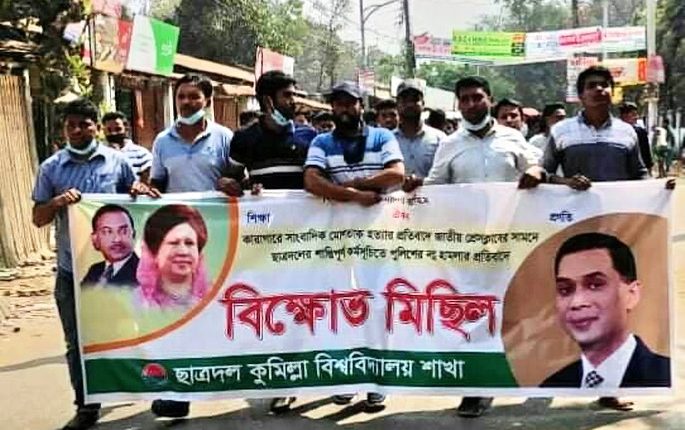 ডিজিটাল নিরাপত্তা আইনে আটক লেখক মুশতাক আহমেদের কারাগারে মৃত্যুর প্রতিবাদে জাতীয় প্রেসক্লাবের সামনে ছাত্রদলের শান্তিপূর্ণ কর্মসূচিতে হামলার প্রতিবাদ জানিয়ে বিক্ষোভ মিছিল করেছে কুমিল্লা বিশ্ববিদ্যালয় (কুবি) শাখা ছাত্রদল। সোমবার দুপুর একটার দিকে বিশ্ববিদ্যালয়ের সামনের সড়কে এই বিক্ষোভ মিছিল করে তারা।