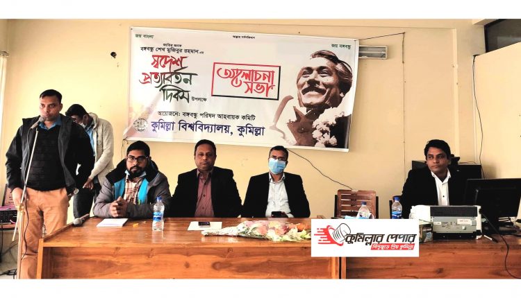 কুমিল্লা বিশ্ববিদ্যালয়ে (কুবি) বঙ্গবন্ধু পরিষদের একাংশের উদ্যোগে জাতির জনক বঙ্গবন্ধু শেখ মুজিবুর রহমানের স্বদেশ প্রত্যাবর্তন দিবস উপলক্ষে আলোচনা সভা অনুষ্ঠিত হয়েছে। সোমবার (১৮ জানুয়ারি) দুপুর সাড়ে বারোটায় বিশ্ববিদ্যালয়ের শিক্ষক লাউঞ্জে কমিটির সদস্য সচিব ড. মোঃ মোকাদ্দেস-উল-ইসলামের সঞ্চালনায় ও পরিষদের অর্থসচিব বিজ্ঞান অনুষদের ডিন ড. দুলাল চন্দ্র নন্দীর সভাপতিত্বে বঙ্গবন্ধু পরিষদের একাংশের এ সভা অনুষ্ঠিত হয়।