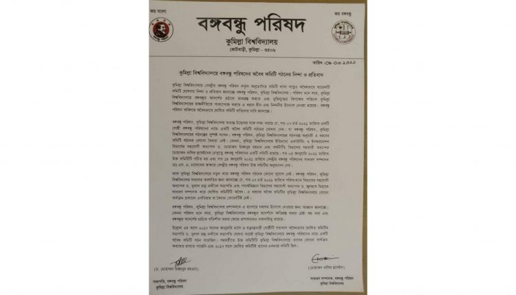 বিজ্ঞপ্তিতে আরো বলা হয়, গত ৭ মার্চ একটি গোষ্ঠী বঙ্গবন্ধু পরিষদের নামে একটি অবৈধ কমিটি গঠনের ঘোষণা দেয় যা বঙ্গবন্ধু পরিষদ, কুমিল্লা বিশ্ববিদ্যালয়ের গঠনতন্ত্রের সুস্পষ্ট লঙ্ঘন। বঙ্গবন্ধু পরিষদের গঠনতন্ত্র অনুযায়ী এ ধরণের কোনো বৈধতা নেই। কেননা ইতিমধ্যে একাউন্টিং ও ইনফরমেশন বিভাগের সহযোগী অধ্যাপক ড. মোহাম্মদ মিজানুর রহমান এবং অর্থনীতি বিভাগের সহকারী অধ্যাপক মোহাম্মদ নাসির হুসেইনের নেতৃত্বে বঙ্গবন্ধু পরিষদের একটি কমিটি রয়েছে।