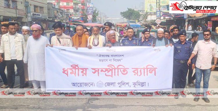 কুমিল্লায় ধর্মীয় সম্প্রীতি শোভাযাত্রা ও আলোচনা সভা অনুষ্ঠিত হয়েছে। বৃহস্পতিবার (৫ ডিসেম্বর) দুপুরে কুমিল্লা জেলা পুলিশের আয়োজনে ঢাকা-চট্টগ্রাম মহাসড়কের পদুয়ার বাজার বিশ্বরোডে এ শোভাযাত্রার আয়োজন করা হয়। ‘ঐক্যবদ্ধ বাংলাদেশ, ছড়াবে না বিদ্বেষ’ এ স্লোগ্লানে ঘণ্টা ব্যাপী আলোচনা সভার আয়োজন করা হয়। এতে সকল ধর্মের প্রতিনিধিরা অংশগ্রহণ করেন।