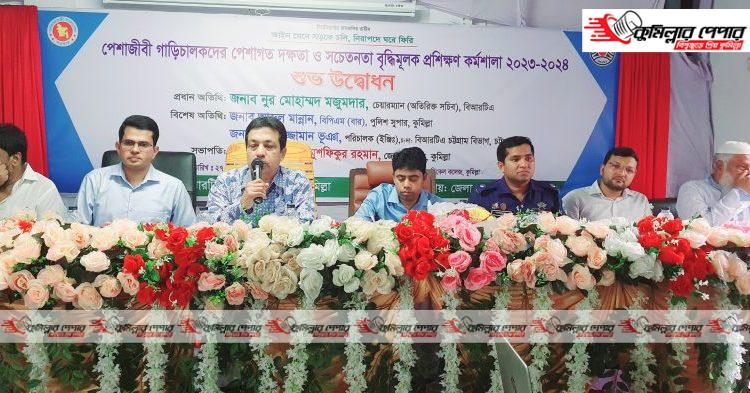 “আইন মেনে সড়ক চলি, নিরাপদে ঘরে ফিরি” এই স্লোগানকে সামনে রেখে বাংলাদেশ রোড ট্রান্সপোর্ট অথরিটিএ কুমিল্লা সার্কেলের উদ্যোগে পেশাদার গাড়ি চালকদের পেশাগত দক্ষতা ও সচেতনতা বৃদ্ধিমূলক প্রশিক্ষণ কর্মশালা অনুষ্ঠিত হয়েছে। বৃহস্পতিবার দুপুরে নগরীর হোমিও কলেজ অডিটরিয়ামে এ কর্মশালা অনুষ্ঠিত হয়। কর্মশাল শেষে প্রশিক্ষণে অংশগ্রহণকারীদের মাঝে সনদপত্র বিতরণ করেন অনুষ্ঠানের প্রধান অতিথি বিআরটি এর চেয়ারম্যান নূর মোহাম্মদ মজুমদার।