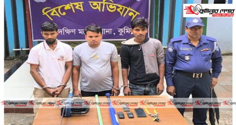 সূত্রে জানা যায় , গোপন সংবাদের ভিত্তিতে কুমিল্লা সদর দক্ষিণ মডেল থানাধীন সিটি কর্পোরেশনের ২৭ নং ওয়ার্ডের চৌয়ারা বাজারে ৩০ নভেম্বর রাতে অভিযান চালায় পুলিশ। অভিযানে চৌয়ারা উলুরচর গ্রামের মৃত ইউনুস মিয়ার ছেলে আওলাদ ওরফে ল্যাংরা আওলাদ , একই গ্রামের সোলাইমানের ছেলে ইউসুফ ও আলী আক্কাসের ছেলে কবির হোসেনকে গ্রেফতার করা হয়। এ সময় তাদের সহযোগী ২-৩ জন দৌড়ে পালিয়ে যান। এ ঘটনায় আসামিদের বিরুদ্ধে সদর দক্ষিণ মডেল থানায় একটি মামলা হয়েছে। আসামিরা চৌয়ারা গরু বাজার পাকা রাস্তার উপর দেশীয় অস্ত্র ও ডাকাতির সরঞ্জামসহ একটি সিলভার কালার প্রাইভেটকার নিয়ে জড়ো হয়ে ডাকাতি করার প্রস্তুতি নিচ্ছিলেন । তারা এলাকার পথচারীদের কাছ থেকে বিভিন্ন মূল্যবান জিনিস ডাকাতি করতেন।