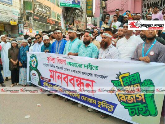 কুমিল্লা বিভাগ বাস্তবায়নের দাবিতে এবার ঐক্যবদ্ধ কণ্ঠে কুমিল্লার সম্মিলিত স্বেচ্ছাসেবী ফোরাম মানববন্ধন ও সমাবেশ করেন।