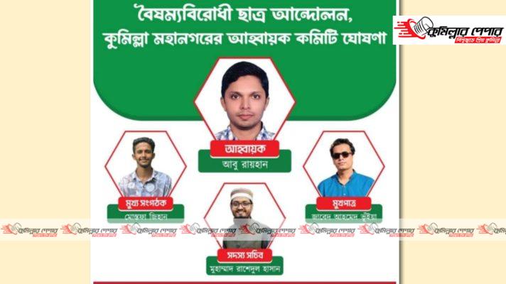 বৈষম্যবিরোধী ছাত্র আন্দোলনের কুমিল্লা মহানগর শাখার কমিটিতে আবু রায়হানকে আহ্বায়ক, মুহাম্মাদ রাশেদুল হাসানকে সদস্যসচিব, মোস্তফা জিহানকে মুখ্য সংগঠক ও জাবেদ আহমেদ ভূইয়াকে মুখপাত্র করা হয়েছে।