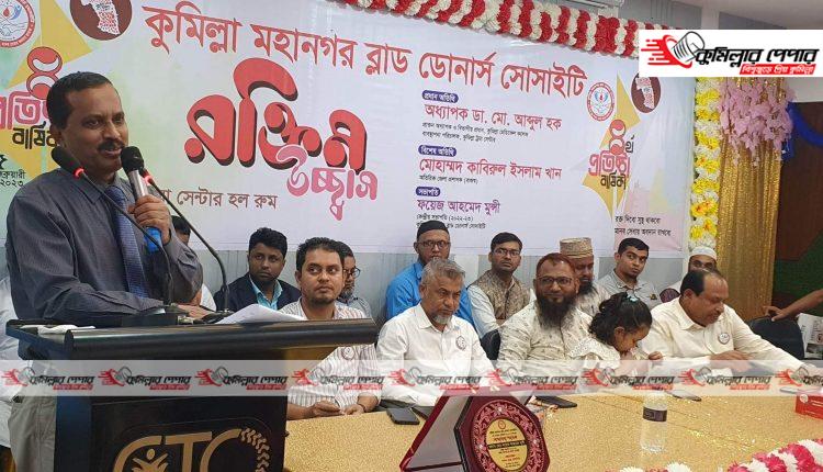 অনুষ্ঠানে কুমিল্লা মহানগর ব্লাড ডোনার্স সোসাইটির কেন্দ্রীয় সভাপতি ফয়েজ আহমেদ মুন্সীর সভাপতিত্বে প্রধান অতিথি ছিলেন, কুমিল্লা ট্রমা সেন্টারের প্রতিষ্ঠাতা পরিচালক অধ্যাপক ডা. মো. আব্দুল হক।