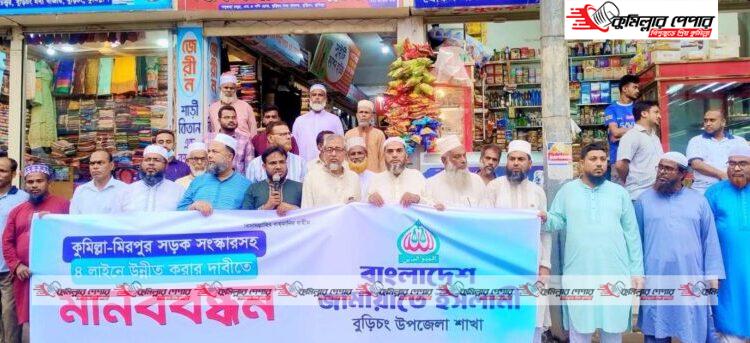 কুমিল্লা-মীরপুর মেজর গনি সড়ক সংস্কার ও চারলেনে উন্নীত করার দাবীতে বুড়িচংয়ে বাংলাদেশ জামায়াতে ইসলামীর মানববন্ধন অনুষ্ঠিত হয়েছে। ২৯জুলাই মঙ্গলবার দুপুরে বাংলাদেশ জামায়াতে ইসলামীর উদ্যোগে কুমিল্লা মীরপুর সড়কের বুড়িচং উপজেলার বসুন্ধরা চত্বরে এই মানববন্ধন অনুষ্ঠিত হয়।
