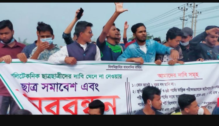 করোনাকালে স্থগিত দ্বিতীয়, চতুর্থ ও ষষ্ঠ পর্বের তাত্ত্বিক পরীক্ষাগুলোকে অটোপাস এবং প্রথম তৃতীয়, পঞ্চম ও সপ্তম পর্বে ক্লাসে শর্ট সিলেবাসে পরীক্ষা নেওয়াসহ চার দফা দাবি আদায়ে কুমিল্লায় সরকারি ও বেসরকারি পলিটেকনিকের শিক্ষার্থীরা মহাসড়ক অবরোধ করেন। এসময় টানা কয়েক ঘণ্টা ঢাকা-চট্টগ্রাম মহাসড়কে যানজট সৃষ্টি হয়। সড়কের দুই ধারে আটকে পড়ে শত শত যাত্রীবাহী বাস ও মালবাহী যান। এতে ভোগান্তির শিকার হন যাত্রীরা।