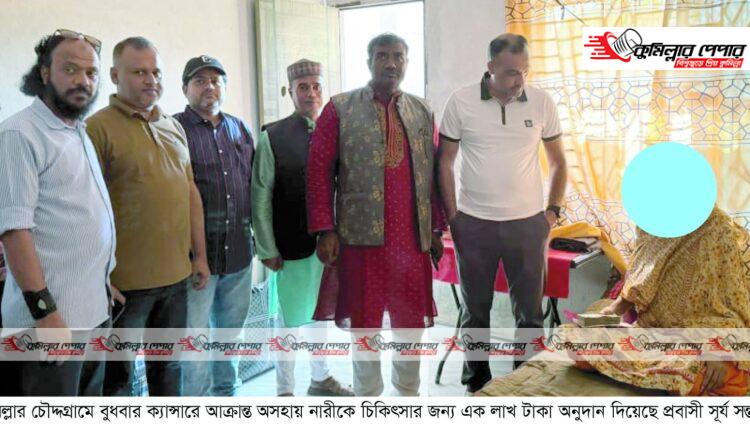 কুমিল্লার চৌদ্দগ্রাম প্রবাসী সূর্য সন্তান সংগঠনের উদ্যোগে ক্যান্সারে আক্রান্ত অসহায় এক নারীর চিকিৎসায় এক লাখ টাকা অনুদান দেয়া হয়েছে।