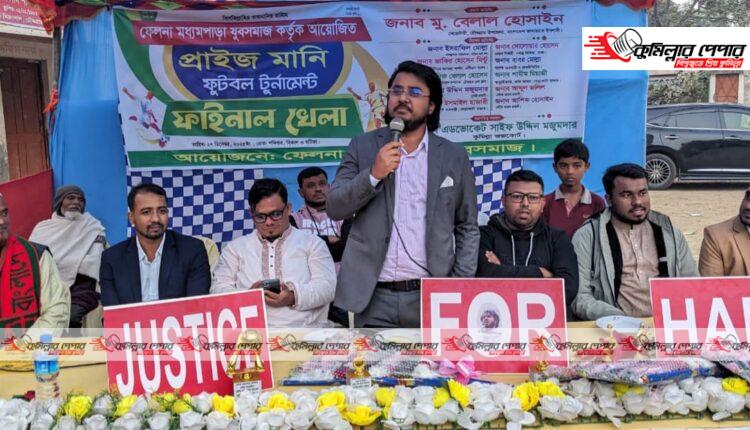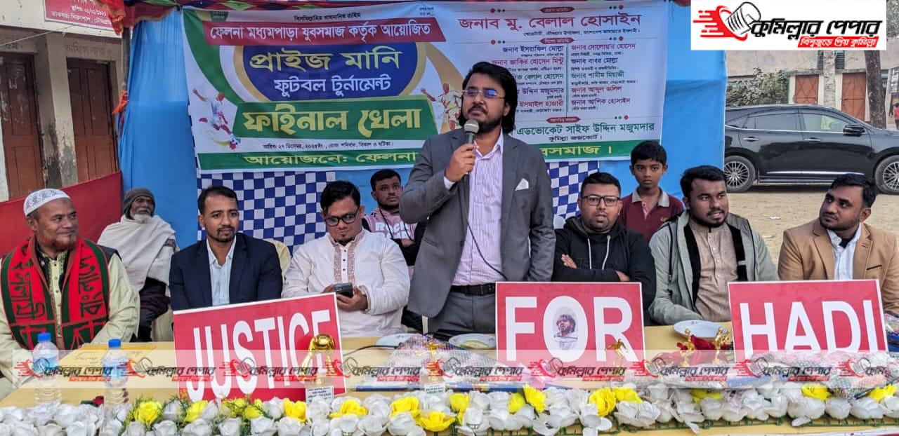 ‘আমরা সবাই হাদী হবো, যুগে যুগে লড়ে যাবো। তুমি কে, আমি কে… হাদী হাদী। জাস্টিস ফর হাদী’ এমন স্লোগানে শহীদ ওসমান হাদীকে স্মরণ করেছে কুমিল্লার চৌদ্দগ্রামের একদল ফুটবল প্রেমী যুবক। শনিবার বিকেলে উপজেলার মুন্সীরহাট ইউনিয়নের ফেলনা মধ্যমপাড়া যুব সমাজের উদ্যোগে ফুটবল টুর্নামেন্টের ফাইনাল খেলার শুরুতে ওসমান হাদীর স্মরণে দুই দলের খেলোয়াড়েরা নানান স্লোগান দেন এবং এক মিনিট নীরবতা পালন করেন।