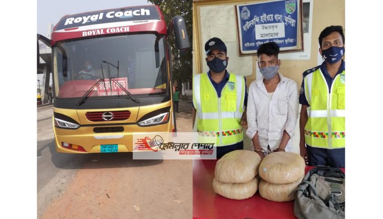 দাউদকান্দি হাইওয়ে থানার ওসি জহিরুল হক জানান, কুমিল্লা থেকে যাত্রীবাহী বাসে করে এক ব্যক্তি ঢাকায় গাঁজা নিয়ে যাচ্ছে এমন গোপন সংবাদের ভিত্তিতে দাউদকান্দি টোলপ্লাজায় অভিযান চালায় হাইওয়ে পুলিশ। সন্দেহভাজন রয়েল কোচ পরিবহনের বাসটি টোলপ্লাজা এলাকায় আসলে তল্লাশি করে পুলিশ সদস্যরা। বাসে থাকা সন্দেহভাজন এক ব্যক্তির একটি স্কুল ব্যাগ তল্লাশি করে এর ভিতর থেকে ৮ কেজি গাঁজা উদ্ধার করা হয়।