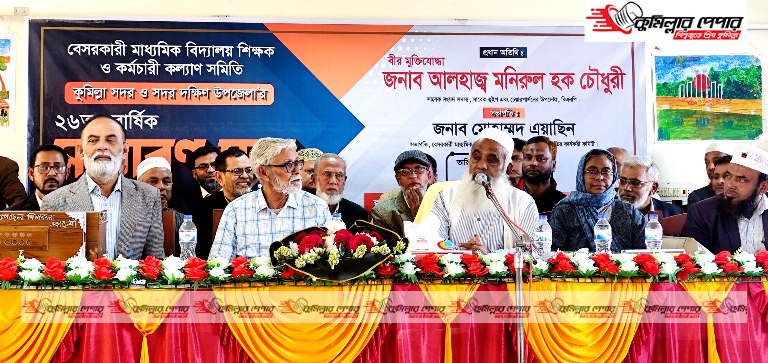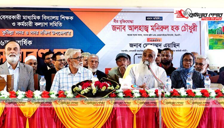 বেসরকারি মাধ্যমিক বিদ্যালয় শিক্ষক ও কর্মচারী কল্যাণ সমিতির সভাপতি মোহাম্মদ এয়াসিনের সভাপতিত্বে সাধারণ সভায় প্রধান অতিথি হিসেবে উপস্থিত ছিলেন কুমিল্লা ৬ আসনের বিএনপি মনোনীত প্রার্থী মনিরুল হক চৌধুরী।
