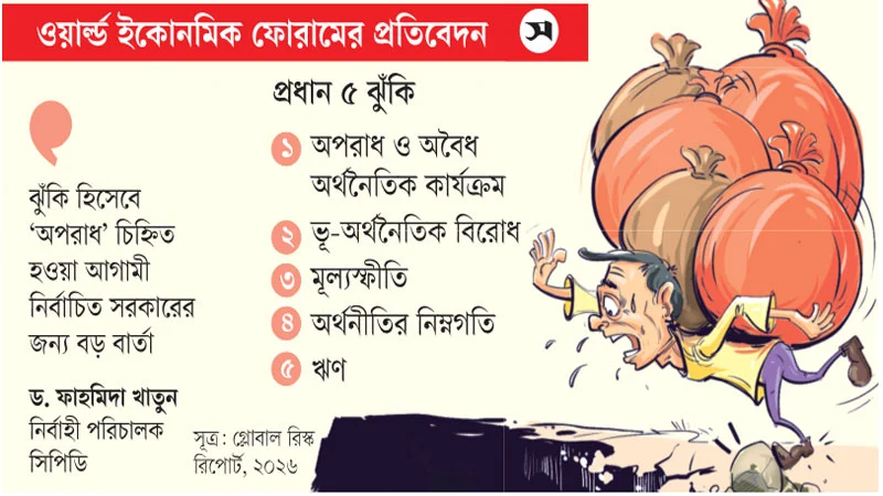ওয়ার্ল্ড ইকোনমিক ফোরামের বৈশ্বিক ঝুঁকি প্রতিবেদনে চলতি বছরে ‘অপরাধ এবং অবৈধ অর্থনৈতিক কর্মকাণ্ড’কে বাংলাদেশের প্রধানতম ঝুঁকি হিসেবে চিহ্নিত করা হয়েছে। আগের বছরগুলোতে মূল্যস্ফীতি, জ্বালানি সংকট, কর্মসংস্থানের মতো বিষয় বাংলাদেশের জন্য প্রধান ঝুঁকি হিসেবে স্থান পেত। এবার নির্বাচনের বছর প্রথমবারের মতো ‘অপরাধ’ সেই জায়গা নিল।
