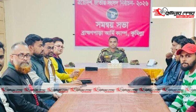 মতবিনিময় সভায় ব্রাহ্মণপাড়া উপজেলায় কর্মরত বিভিন্ন ইলেকট্রনিক ও প্রিন্ট মিডিয়ার প্রতিনিধিরা উপস্থিত ছিলেন। সেনাবাহিনীর পক্ষ থেকে সভার নেতৃত্ব দেন সংশ্লিষ্ট ক্যাম্প কমান্ডার। সাংবাদিকরা সেনাবাহিনীর এই উদ্যোগকে স্বাগত জানিয়ে একটি উৎসবমুখর ও শান্তিপূর্ণ নির্বাচনের প্রত্যাশা ব্যক্ত করেন।