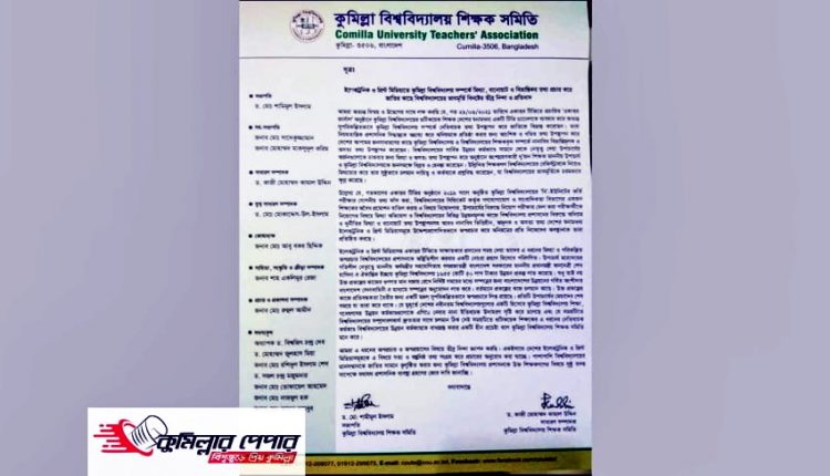 কুমিল্লা বিশ্ববিদ্যালয়কে (কুবি) নিয়ে মিথ্যা, বানোয়াট ও বিভ্রান্তিকর তথ্য প্রচারের নিন্দা জানিয়েছে কুমিল্লা বিশ্ববিদ্যালয় শিক্ষক সমিতি। বৃহস্পতিবার সকালে সমিতির সভাপতি অধ্যাপক ড. মো. শামীমুল ইসলাম ও সাধারণ সম্পাদক ড. কাজী মোহাম্মদ কামাল উদ্দিন স্বাক্ষরিত বিজ্ঞপ্তি তারা এ নিন্দা জানান।