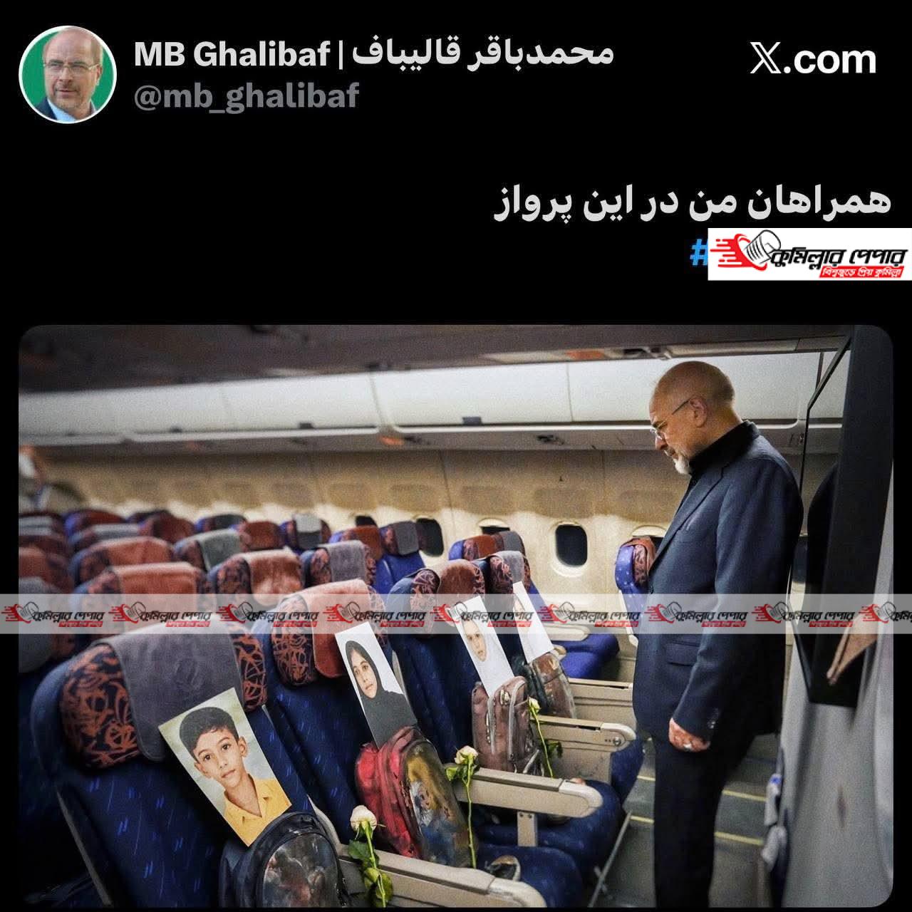 পাকিস্তানে পৌঁছানোর পর ইরানের পার্লামেন্টের স্পিকার মোহাম্মদ বাঘের গালিবাফ সামাজিক যোগাযোগমাধ্যম এক্সে একটি ছবি পোস্ট করেছেন। ওই ছবিতে দেখা যায়, তাদের উড়োজাহাজের সামনের চারটি আসনে চারটি শিশুর ছবি। মিনাবের স্কুলে যুক্তরাষ্ট্রের হামলায় নিহত ওই শিশুদের ছবির নিচেই রাখা একটি করে স্কুলব্যাগ ও একটি করে ফুল। ছবির ক্যাপশনে গালিবাফ লেখেন, ‘ফ্লাইটে আমার সঙ্গীরা’।
