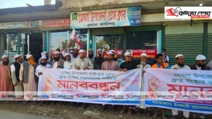কুমিল্লার মেঘনা উপজেলার হাইওয়ে সড়ক  সদর উপজেলা থেকে ভাটেরচর হয়ে ঢাকা–চট্টগ্রাম মহাসড়ক পর্যন্ত প্রায় ৯ কিলোমিটার রাস্তা দ্রুত সংস্কারের দাবিতে মানববন্ধন করেছে ইসলামী আন্দোলন বাংলাদেশ।