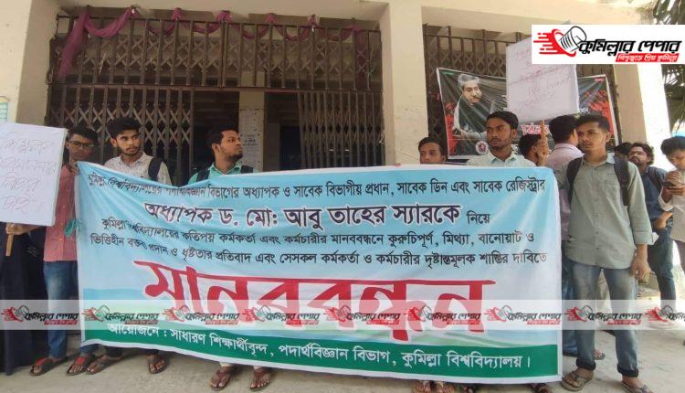 কুমিল্লা বিশ্ববিদ্যালয়ের (কুবি) সাবেক রেজিস্ট্রার (অতিরিক্ত দায়িত্ব) ও পদার্থবিজ্ঞান বিভাগের অধ্যাপক ড. মো. আবু তাহেরকে নিয়ে কর্মকর্তা-কর্মচারীদের কুরুচিপূর্ণ, মিথ্যা, বানোয়াট ও ভিত্তিহীন বক্তব্যের প্রতিবাদে মানববন্ধন করেছে পদার্থবিজ্ঞান বিভাগের শিক্ষার্থীরা। এসময় তারা ৭ দিনের মধ্যে বিচারের দাবিতে আল্টিমেটাম প্রদান করেন। সোমবার (২৯ আগস্ট) সকাল ১১টায় প্রশাসন ভবনের সামনে এই মানববন্ধন অনুষ্ঠিত হয়।