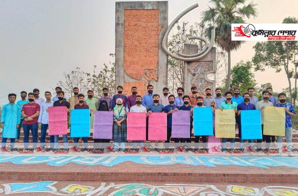 সাভারে কর্মরত প্রথম আলোর নিজস্ব প্রতিবেদক শামসুজ্জামান শামসকে সিআইডি পরিচয়ে তুলে নেয়ার ঘটনায় বিভিন্ন প্ল্যাকার্ড হাতে ও মুখে কালো কাপড় বেঁধে মুক্তির দাবি জানিয়েছে কুমিল্লা বিশ্ববিদ্যালয় সাংবাদিক সমিতি (কুবিসাস)।