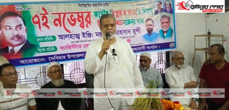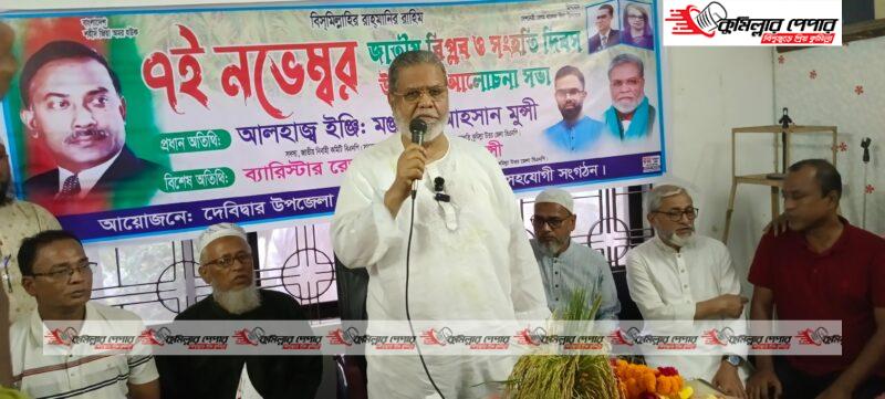 বিএনপি মনোনীত প্রার্থী সাবেক চারবারের এমপি আলহাজ¦ ইঞ্জিনিয়ার মঞ্জুরুল আহসান মুন্সী বলেন, ১৯৭৫ সালের এই দিনে সমগ্র জাতি যখন অনিশ্চয়তার সম্মুখীন, তখন সিপাহি-জনতার মিলিত বিপ্লব জাতীয় স্বাধীনতা ও সার্বভৌমত্বের বিরুদ্ধে সব ষড়যন্ত্র নস্যাৎ করে দিয়ে দেশপ্রেমের এক অনন্য নজির সৃষ্টি করে। শহিদ প্রেসিডেন্ট জিয়াউর রহমানকে বন্দিদশা থেকে মুক্ত করে এনে সিপাহি-জনতা তাকে রাষ্ট্রীয় ক্ষমতায় অধিষ্ঠিত করে। তিনি ক্রান্তিময় সেই অবস্থা থেকে উত্তরণ ঘটিয়ে দেশে প্রবর্তন করেন বহুদলীয় গণতন্ত্র। সূচনা করেন উন্নয়ন ও উৎপাদনের নবধারার রাজনীতি। শুক্রবার বিকালে মঞ্জুরুল আহসান মুন্সীর দেবিদ্বারস্থ বাস ভবনের হল রুমে দিবসটি উপলক্ষে আলোচনা সভায় প্রধান অতিথির বক্তব্যে তিনি এসব কথা বলেন।
