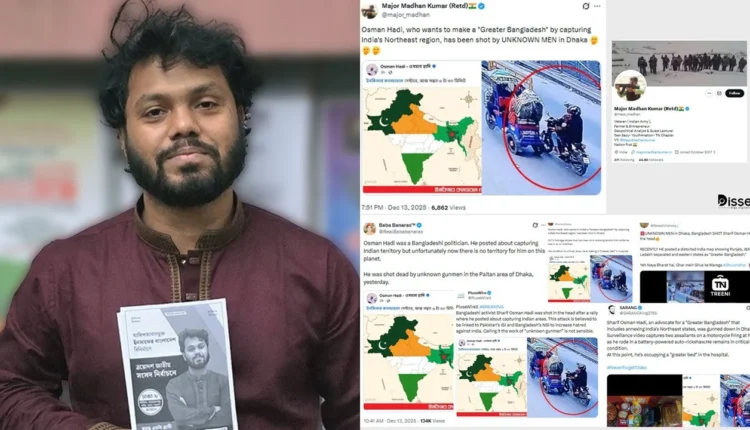 ভারতীয় সাবেক সেনা কর্মকর্তা এবং ভারতীয় ক্যাম্পেইন গ্রুপ Youth4Nation – TN Chapter-এর সাধারণ সম্পাদক মেজর মাধান কুমার (অব.) এক্স পোস্টে দাবি করেছেন, ওসমান হাদী ভারতের উত্তর-পূর্ব অঞ্চল দখল করে ‘গ্রেটার বাংলাদেশ’ গড়ে তুলতে চেয়েছিলেন এবং ঢাকায় অজ্ঞাতনামাদের দ্বারা গুলিবিদ্ধ হয়েছেন। মেজর মাধান কুমারের সাম্প্রতিক এক্স পোস্টগুলো বিশ্লেষণ করে দেখা যায়, তিনি ভারতের ক্ষমতাসীন দল ভারতীয় জনতা পার্টি (বিজেপির) পক্ষে প্রচারণা চালাচ্ছেন।