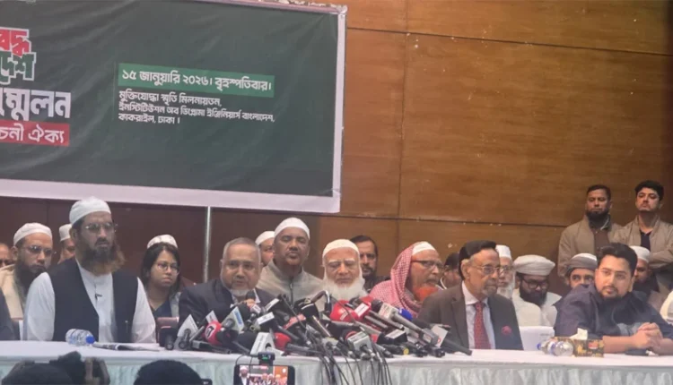 বৃহস্পতিবারের সংবাদ সম্মেলনে উপস্থিত ছিলেন বাংলাদেশ জামায়াতে ইসলামীর আমির ডা শফিকুর রহমান বাংলাদেশ খেলাফত মজলিসের আমীর আল্লামা মামুনুল হক, এলডিপির চেয়ারম্যান কর্ণেল (অব:) অলী আহমেদ, এনসিপির আহবায়ক নাহিদ ইসলাম, বিডিপির সভাপতি আনোয়ারুল ইসলাম চাঁদ, এবি পার্টির চেয়ারম্যান মজিবুর রহমান মঞ্জু, খেলাফত মজলিশের মহাসচিব ড. আহমাদ আব্দুর কাদের, জামায়াতের নায়েবে আমির ডা সৈয়দ আব্দুল্লাহ মোহাম্মদ তাহের, জাগপার সিনিয়র সহ সভাপতি প্রকৌশলি রাশেদ প্রধান, বাংলাদেশ খেলাফত আন্দোলনের নয়েবে আমির মাও মুজিবুর রহমান হামিদী, নেজামে ইসলামি পার্টির আনোয়ারুল হক, বাংলাদেশ খেলাফত মজলিসের মহাসচিব জালাল উদ্দিন প্রমুখ, এনসিপির মুখপাত্র আসিফ মাহমুদ সজিব ভুইঁয়া, ঢাকা ৮ আসনের এনসিপি মনোনীত এনসিপির নাসিরুদ্দিন পাটওয়ারী। এছাড়া দলগুলোর শীর্ষ নেতারা উপস্থিত ছিলেন।