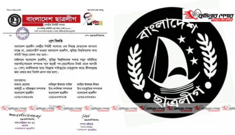 উল্লেখ্য, ছাত্রলীগের সভাপতি ও সাধারণ সম্পাদক স্বাক্ষরিত বিজ্ঞপ্তিতে বলা হয়, মেয়াদোত্তীর্ণ হওয়ায় বাংলাদেশ ছাত্রলীগ, কুমিল্লা বিশ্ববিদ্যালয় শাখা কমিটি বিলুপ্ত ঘোষণা করা হলো।